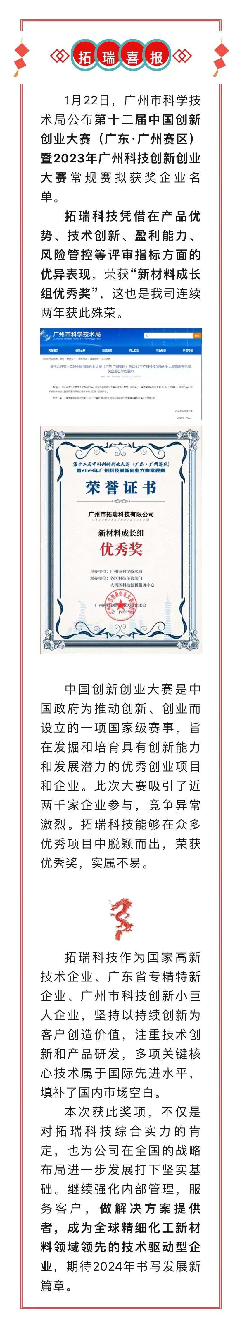 喜报!热烈祝贺拓瑞科技荣获第十二届中国创新创业大赛(广东·广州赛区)优秀奖